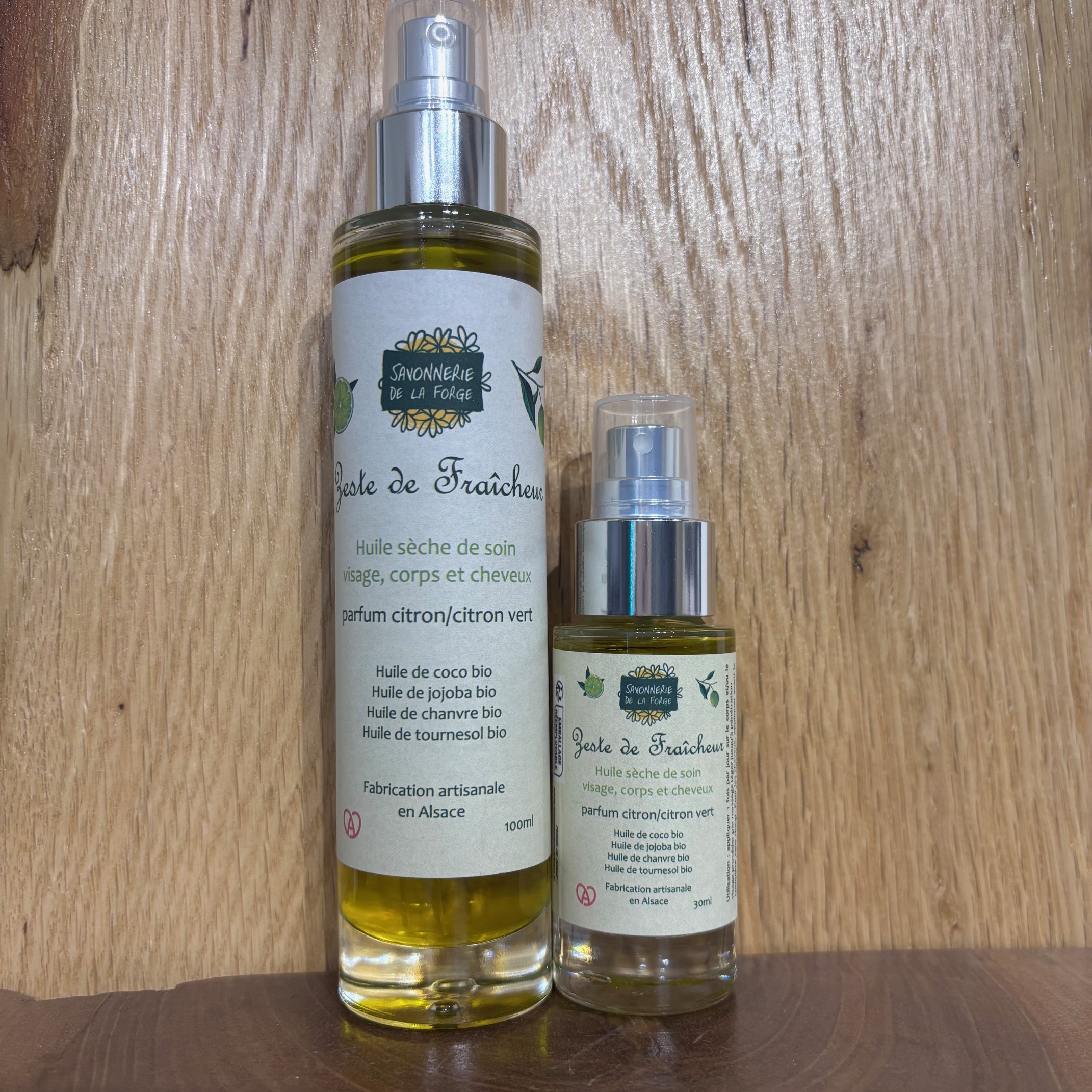 Découvrez votre future huile sèche de soin Zeste de Fraîcheur, une formule artisanale fabriquée en Alsace à partir d’huiles sélectionnées par mes soins. Sa texture légère et non grasse pénètre rapidement, laissant votre peau douce et satinée, sans fini collant.
